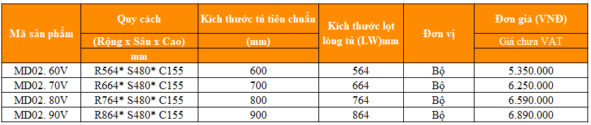Lưu ý: MD02V kích thước 600mm không bao gồm khay nhựa để thìa đũa.
